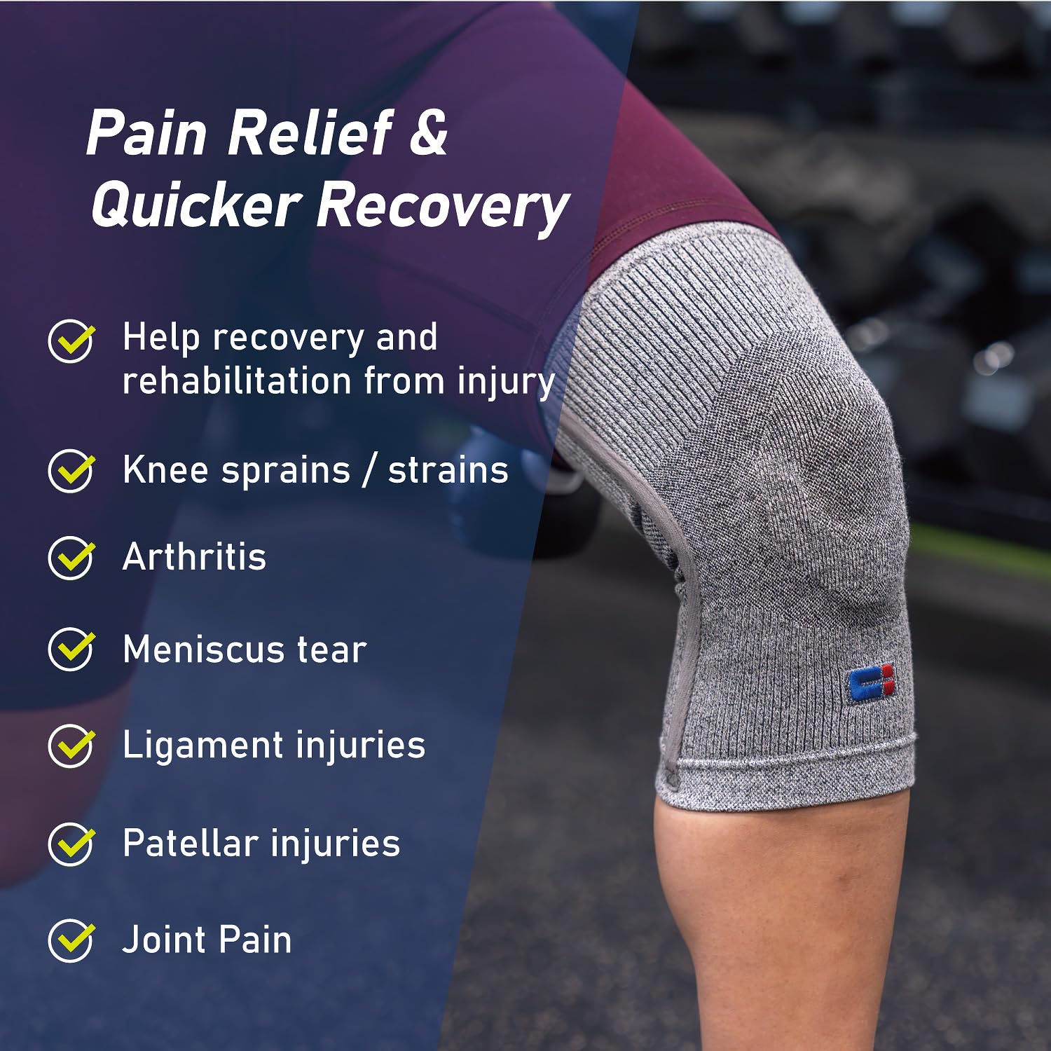 Comforband Recovery Knee Compression Support provides targeted relief for joint pain, swelling, and sports injuries. Infused with germanium and bamboo charcoal, this knee brace stimulates circulation and promotes natural healing when activated by body heat. The shock-absorbing patella pad cushions impact while multi-zonal compression technology delivers support exactly where you need it without restricting movement. Anti-slip design stays in place during activity, and the non-irritating fabric ensures all-day comfort. Ideal for arthritis, tendonitis, sprains, and post-injury recovery. Adjustable fit for men and women.